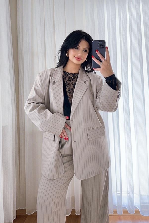 İnce Çizgili Oversize Blazer Ceket - Bej