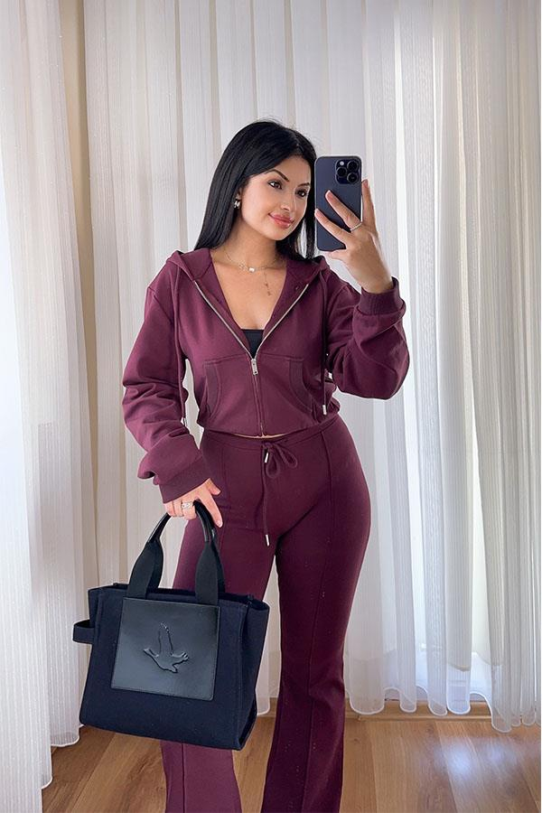 Kapüşonlu Fermuarlı Basic Sweatshirt - Bordo